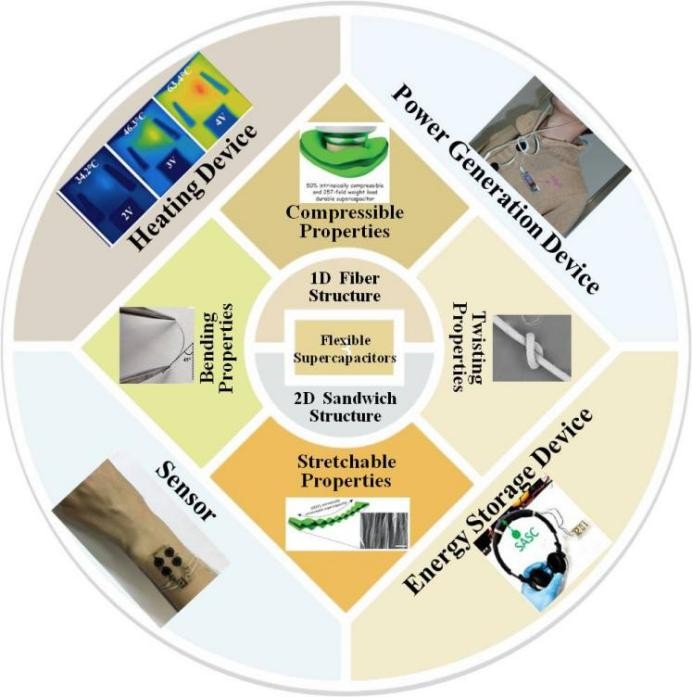 柔性超級(jí)電容器的結(jié)構(gòu)、特性和應(yīng)用的示意圖