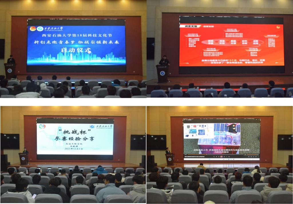 在鄠邑校區(qū)弘石學(xué)術(shù)報告廳,舉辦了西安石油大學(xué)第十八屆科技文化節(jié)啟動儀式和2024年“挑戰(zhàn)杯”大學(xué)生創(chuàng)業(yè)計劃競賽發(fā)布活動。活動邀請了“挑戰(zhàn)杯”全國大學(xué)生課外學(xué)術(shù)科技作品競賽主體賽全國二等獎《國潮文創(chuàng)正當(dāng)時,賦能“紅色”巧出圈——文創(chuàng)產(chǎn)品的紅色文化傳播調(diào)研》、“黑科技”專項賽恒星級獎項《觀往知來新型智能管線安全模擬預(yù)測系統(tǒng)》、第十四屆“挑戰(zhàn)杯”陜西省大學(xué)生課外學(xué)術(shù)科技作品競賽二等獎《井下醫(yī)生——致密砂巖地層井壁穩(wěn)定智能評價與隨鉆預(yù)測一體化系統(tǒng)》《操控式橫縱兩向鋪壓草方格生態(tài)修復(fù)機(jī)械》等優(yōu)秀獲獎團(tuán)隊成員講述作品思路并分享參賽經(jīng)驗。