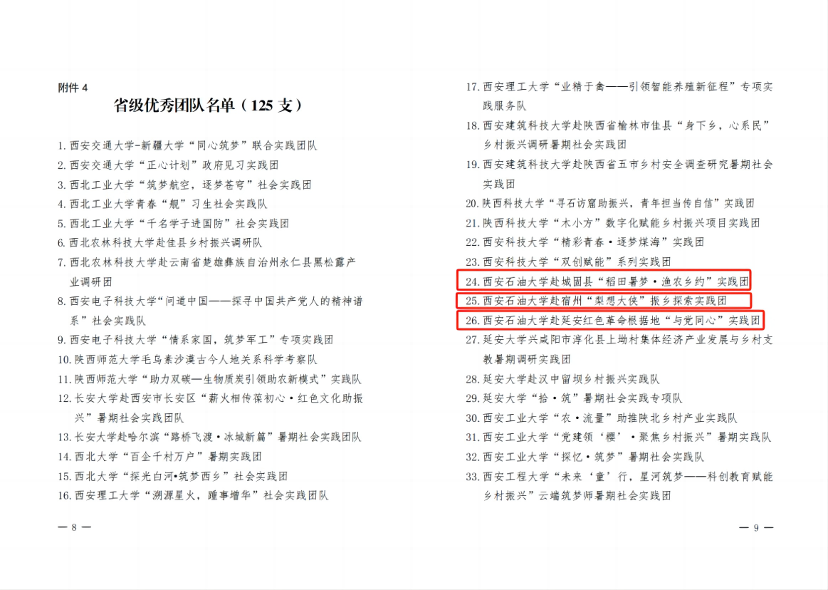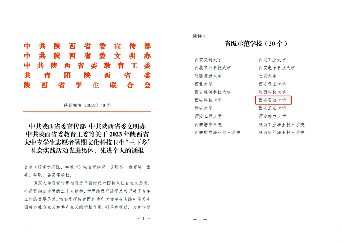 近日,由陜西省委宣傳部、省委文明辦、省委教育工委、團(tuán)省委、省學(xué)聯(lián)等單位聯(lián)合組織開(kāi)展的“2023年陜西省大中專學(xué)生志愿者暑期文化科技衛(wèi)生‘三下鄉(xiāng)’社會(huì)實(shí)踐活動(dòng)”評(píng)選表彰結(jié)果揭曉,我校榮獲2023年“三下鄉(xiāng)”活動(dòng)省級(jí)示范學(xué)校,地球科學(xué)與工程學(xué)院“赴城固縣‘稻田暑夢(mèng)·漁農(nóng)鄉(xiāng)約’實(shí)踐團(tuán)”、經(jīng)濟(jì)管理學(xué)院“赴宿州‘梨想大俠’振鄉(xiāng)探索實(shí)踐團(tuán)”、石油工程學(xué)院赴“延安紅色革命根據(jù)地‘與黨同心’實(shí)踐團(tuán)”被評(píng)為省級(jí)優(yōu)秀團(tuán)隊(duì)。王澤文、宋亞文、劉宇航被評(píng)為省級(jí)先進(jìn)個(gè)人。經(jīng)濟(jì)管理學(xué)院《數(shù)商興農(nóng)背景下農(nóng)村電商發(fā)展影響因素及優(yōu)化策略調(diào)研報(bào)告》被評(píng)為省級(jí)優(yōu)秀調(diào)研報(bào)告,并獲團(tuán)省委專項(xiàng)資助。