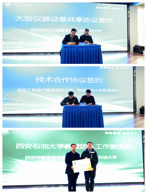 期間,實驗室管理處負(fù)責(zé)人代表學(xué)校與灃京工業(yè)園簽訂大型儀器設(shè)備開放共享協(xié)議;化學(xué)化工學(xué)院楊博老師團隊與西安匯智醫(yī)療集團有限公司簽訂技術(shù)合作意向協(xié)議;科技處負(fù)責(zé)人代表學(xué)校接受灃京工業(yè)園管委會頒發(fā)的西安石油大學(xué)教授團隊工作室牌匾。