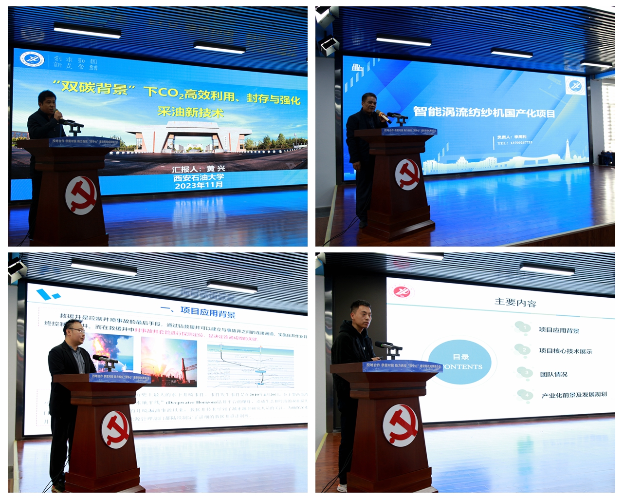會議期間,灃京工業(yè)園管委會黨工委書記王鵬濤介紹了西安石油大學(xué)科技成果轉(zhuǎn)化基地的服務(wù)保障政策,為科研團隊成果轉(zhuǎn)化落地提供良好的創(chuàng)業(yè)環(huán)境。石油工程學(xué)院黃興教授,電子工程學(xué)院李周利教授、黨博教授以及材料科學(xué)與工程學(xué)院翟文彥博士結(jié)合多年科技攻關(guān)和技術(shù)沉淀,分別就“雙碳背景”下二氧化碳高效利用、封存與強化采油新技術(shù),智能渦流紡紗機國產(chǎn)化,特種定向井電磁探測定位技術(shù),先進抗磨耐蝕復(fù)合材料技術(shù)等展示和推介。