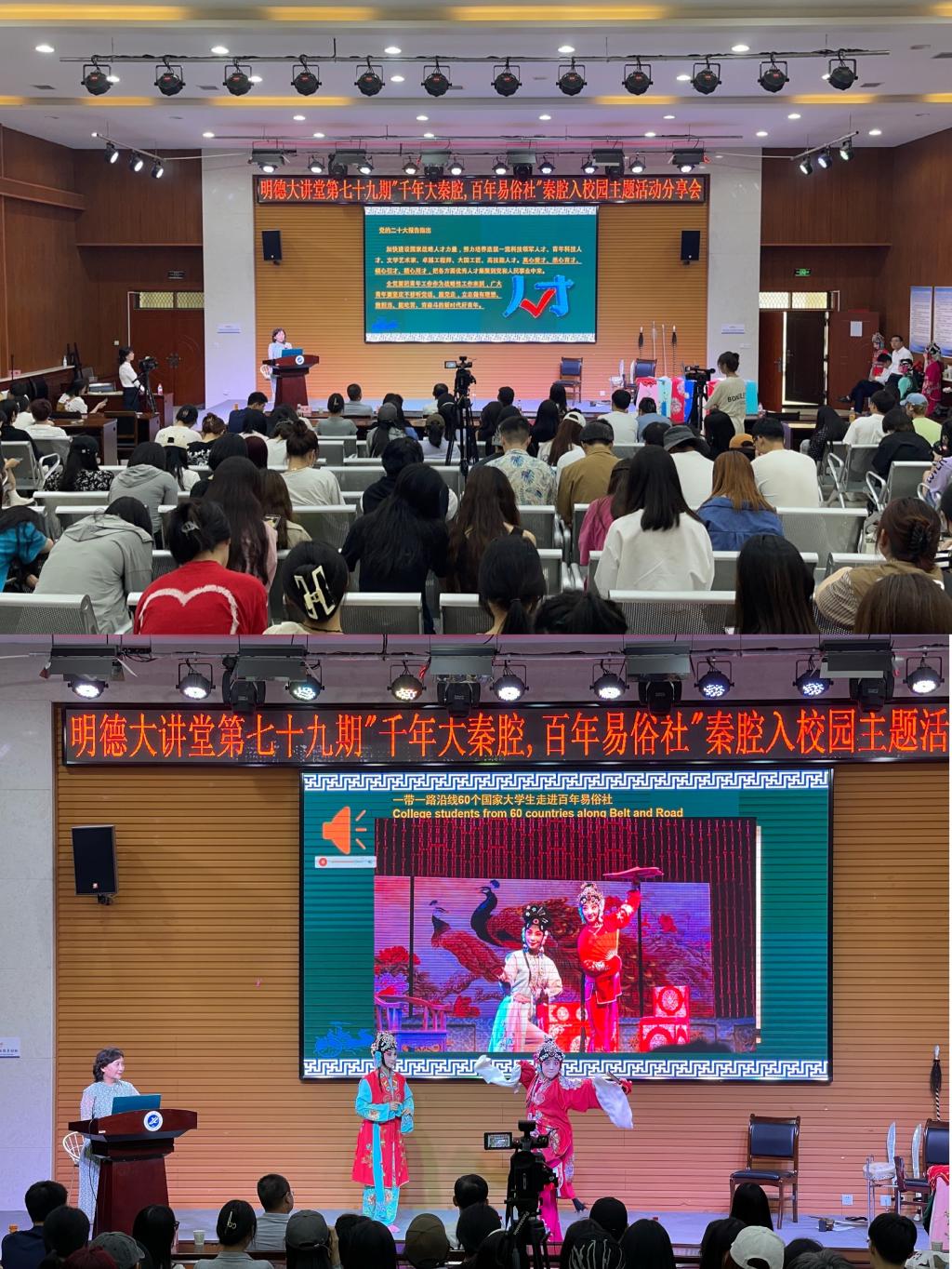 6月21日下午,“千年大秦腔,百年易俗社”秦腔入校園主題活動分享會于鄠邑校區(qū)崇文樓就業(yè)指導中心多功能報告廳舉行。西安易俗社社長惠敏莉女士應邀來校作了題為《做文化自信、道路自信、理論自信、制度自信的文藝工作者》講座,易俗社秦腔演員現場演唱《三滴血》等劇目,200余名師生現場觀看。校黨委副書記張木出席,人文學院相關負責人參加分享會。