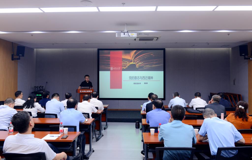 在實(shí)踐研學(xué)現(xiàn)場教學(xué)環(huán)節(jié),校黨委理論學(xué)習(xí)中心組(擴(kuò)大)在交大西遷博物館報告廳聽取了專題黨課。西安交通大學(xué)校史與大學(xué)文化研究中心副研究館員、西遷精神宣講團(tuán)專家組成員楊瀾濤博士以《黨的意志與西遷精神》為題,對黨中央決策西遷的歷程及影響進(jìn)行了詳細(xì)講解。在交大西遷博物館,研學(xué)人員通過實(shí)地參觀和聆聽講解員介紹,回顧了交通大學(xué)的西遷征程,領(lǐng)略了交大興學(xué)強(qiáng)國、崇德尚實(shí)的學(xué)風(fēng)與“起點(diǎn)高、要求嚴(yán)、基礎(chǔ)厚、重實(shí)踐”的優(yōu)良辦學(xué)傳統(tǒng),學(xué)習(xí)了“西遷人”感人至深的先進(jìn)事跡,體會了以“胸懷大局、無私奉獻(xiàn)、弘揚(yáng)傳統(tǒng)、艱苦創(chuàng)業(yè)”為核心內(nèi)涵的西遷精神。