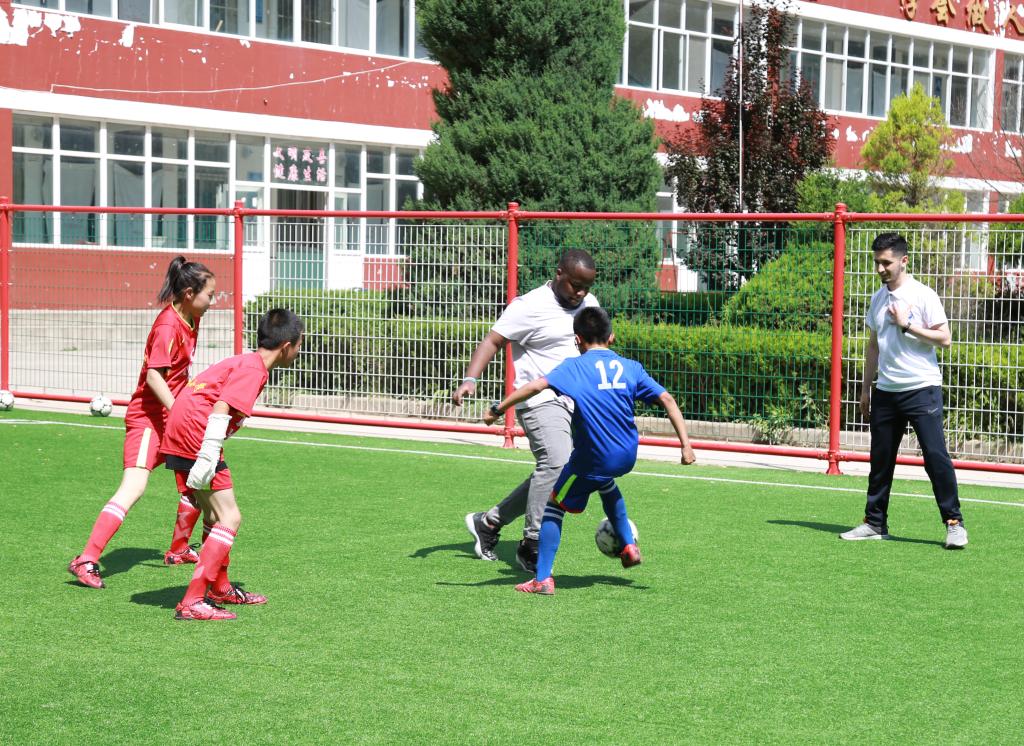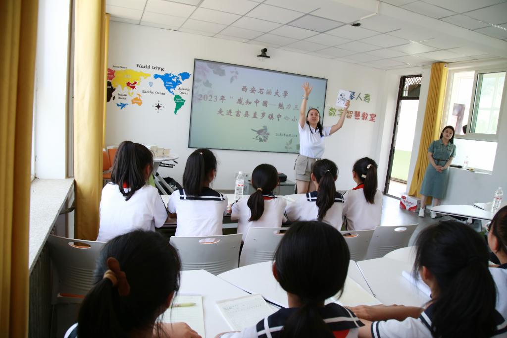 在直羅小學(xué),留學(xué)生們?yōu)樾W(xué)生們帶來(lái)了有趣生動(dòng)的英語(yǔ)口語(yǔ)課。實(shí)踐教學(xué)活動(dòng)是“感知中國(guó)”活動(dòng)重要組成部分,在互動(dòng)課堂上,小學(xué)生們與來(lái)自不同國(guó)家的留學(xué)生互動(dòng)交流,來(lái)自馬來(lái)西亞的詠翰分別用中文、英文、馬來(lái)西亞語(yǔ)給小學(xué)生們教了生日祝福歌,來(lái)自哈薩克斯坦的小云用圖畫(huà)、猜謎游戲?yàn)樾W(xué)生們上了一堂生動(dòng)活潑的英語(yǔ)課。有趣的英語(yǔ)課堂激發(fā)了小學(xué)生學(xué)習(xí)英語(yǔ)的熱情和濃厚的興趣,課堂氣氛熱烈,同學(xué)們發(fā)言踴躍,一節(jié)課下來(lái)小學(xué)生們意猶未盡。英語(yǔ)課堂外,是以“傳播快樂(lè)足球”為主題的足球互動(dòng)活動(dòng),留學(xué)生與小學(xué)生們開(kāi)展了一場(chǎng)足球友誼賽。場(chǎng)上,參賽隊(duì)員們齊心協(xié)力,奮勇拼搏。帶球、護(hù)球、傳球、射球,動(dòng)作嫻熟,拼勁十足。就這樣,初次來(lái)到直羅小學(xué)的留學(xué)生們感受到了當(dāng)?shù)氐娘L(fēng)土人情,并對(duì)接下來(lái)與孩子們的相遇充滿了期待?;顒?dòng)中,我校專(zhuān)程為直羅小學(xué)帶去了50本捐贈(zèng)圖書(shū)和5個(gè)嶄新足球。