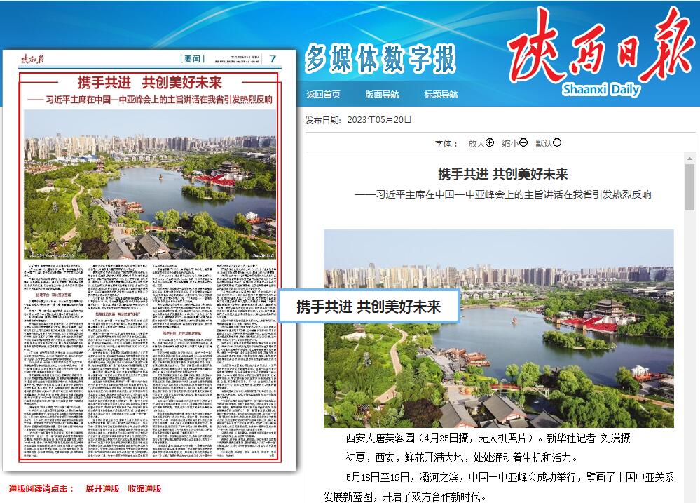 《陜西日報》之《攜手共進 共創(chuàng)美好未來——習近平主席在中國—中亞峰會上的主旨講話在我省引發(fā)熱烈反響》鏈接:https://esb.sxdaily.com.cn/pc/content/202305/20/content_809583.html