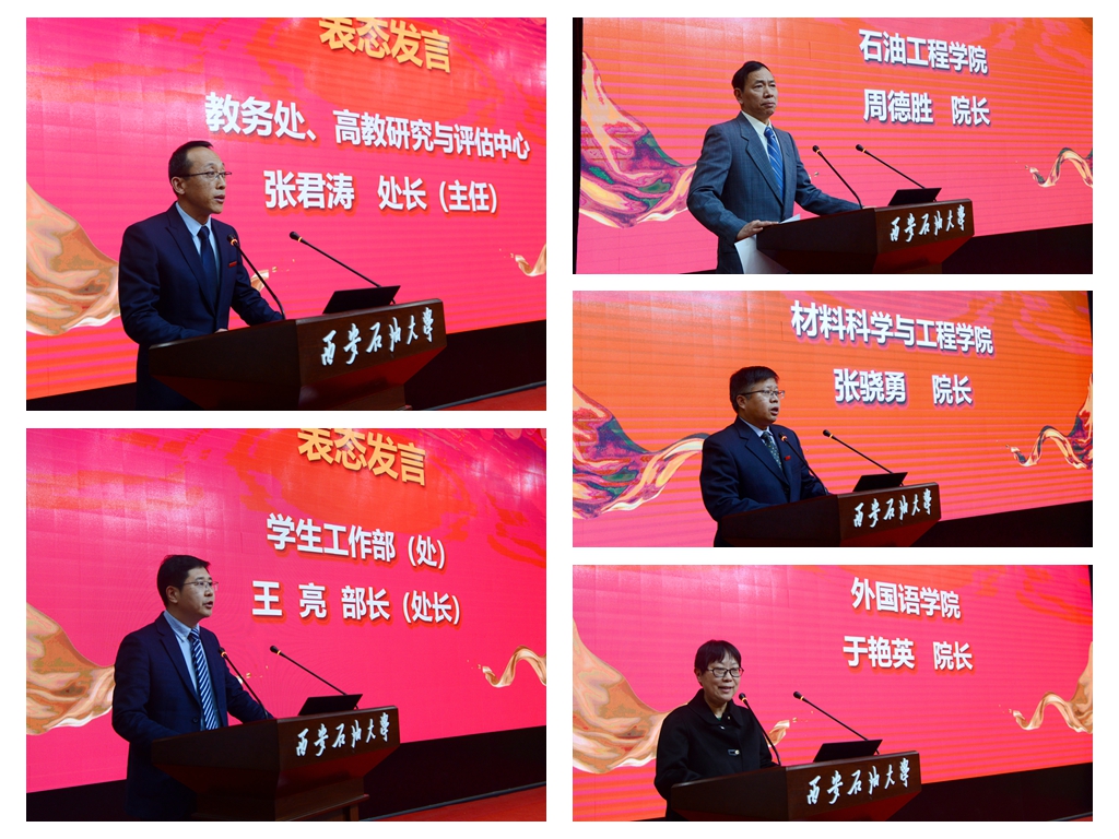 教務處、學生工作部、石油工程學院、材料科學與工程學院、外國語學院主要負責人分別代表各職能部門和院(系)發(fā)言,他們表示將積極組織單位全體師生深入學習新一輪本科教育教學審核評估方案和要求,按照學校審核評估工作方案要求和此次本科教育教學審核評估工作部署推進會會議精神,做好各項工作安排部署,全面落實立德樹人根本任務,保質(zhì)保量按時完成各項審核評估工作。