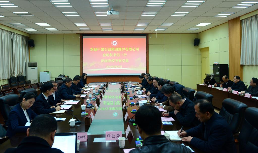 校黨委書記賽云秀代表學校對金明權一行來訪表示歡迎,對中國石油集團測井有限公司多年來給予學校的大力支持表示感謝。他指出,中油測井公司注重科技創(chuàng)新,大力發(fā)展測井核心技術,按照“研發(fā)、制造、服務”一體化發(fā)展道路,在使用先進技術為油田勘探開發(fā)全過程提供優(yōu)質(zhì)服務以及努力滿足油氣儲量產(chǎn)量增長對測井技術的全方位要求方面取得了顯著成績。公司的快速發(fā)展也為我校提供了廣闊的舞臺。他希望,雙方在前期合作的基礎上,進一步在人才培養(yǎng)、科研生產(chǎn)、技術研究等方面,加強交流、深化合作。