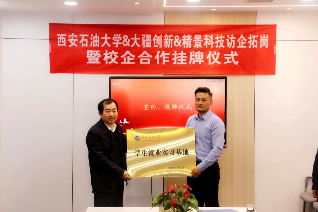 在與會人員共同見證下,舉行了精景科技公司和西安石油大學聯(lián)合培養(yǎng)暨校外實習基地簽約儀式及校企合作掛牌儀式。李天太為企業(yè)掛牌,張愈和譚成仟代表雙方簽約。