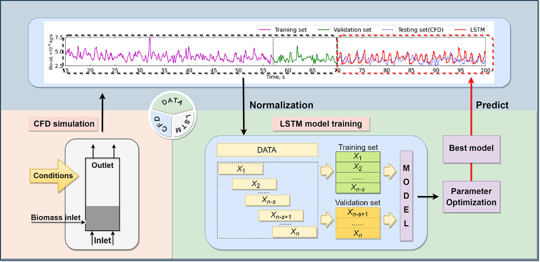 該研究成果基于精準(zhǔn)的生物質(zhì)流化床快速熱解CFD模擬數(shù)據(jù),結(jié)合深度學(xué)習(xí)模型開發(fā)了一種基于長短期記憶神經(jīng)網(wǎng)絡(luò)的CFD模擬智能加速方法。該方法能夠快速預(yù)測反應(yīng)器出口的產(chǎn)品流率,在保證足夠高預(yù)測精度的前提下降低至少30%的CFD計算需求,同時對不同工況均具有良好的適用性。研究成果為流化床生物質(zhì)快速熱解反應(yīng)器的智能設(shè)計優(yōu)化提供了一條重要途徑,能夠促進(jìn)生物質(zhì)資源高效利用技術(shù)的開發(fā)及應(yīng)用,有助于我國“雙碳”目標(biāo)的實(shí)現(xiàn)。