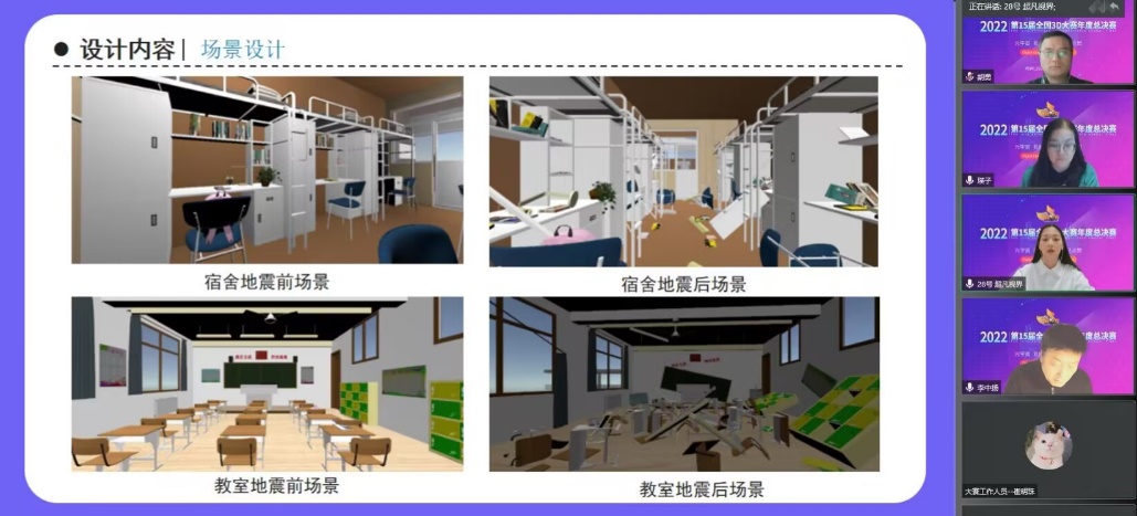 結(jié)合當前疫情防控形勢,全國總決賽采用了線上為主的方式進行,邀請百余位行業(yè)/院校/企業(yè)專家參與了總決賽作品的評審工作,評審主要考察設(shè)計創(chuàng)意性、技術(shù)應(yīng)用創(chuàng)新性、工程實用性、美學(xué)、商業(yè)可開發(fā)價值、社會價值等多項因素。此次大賽開辟四類參賽作品類型:工業(yè)、文化、人居設(shè)計以及元宇宙創(chuàng)建大賽,參賽主題依據(jù)不同類型各有側(cè)重和特色。我校計算機學(xué)院學(xué)子的數(shù)字文化設(shè)計類作品《基于VR的校園地震逃生體驗系統(tǒng)》,以科普地震逃生知識和技能為背景,通過VR技術(shù)讓體驗者更為直觀生動的感受到地震發(fā)生時的情況,以新穎的方式增強學(xué)生面對地震突發(fā)時的應(yīng)急能力,對地震應(yīng)急救援有較好的應(yīng)用價值。