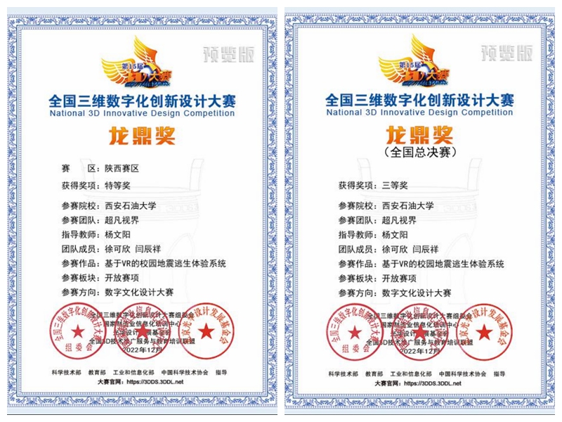 近日,第15屆全國3D大賽年度競賽成功舉辦。全國31個省、直轄市、自治區(qū)賽區(qū)的800多所院校報名參賽,1000多家企事業(yè)單位參與賽事。各賽區(qū)、各院校參賽報名團隊近20000個,提交初賽作品近20000件。經(jīng)過激烈角逐,由我校計算機學(xué)院教師楊文陽指導(dǎo),徐可欣和閆辰祥2位同學(xué)組成的“超凡視界”團隊在陜西賽區(qū)榮獲特等獎,在全國總決賽中榮獲三等獎。