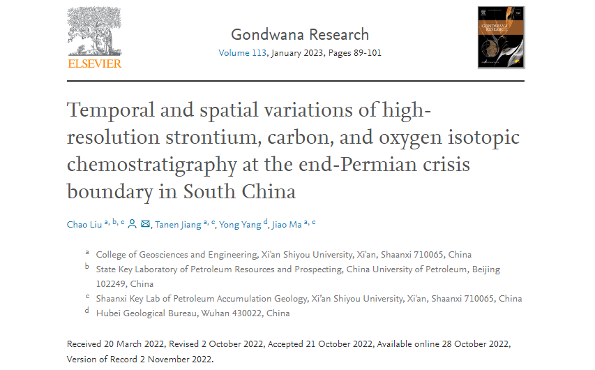 近日,我校地球科學(xué)與工程學(xué)院教師劉超在國際地學(xué)頂級期刊Gondwana Research在線發(fā)表了題為“Temporal and spatial variations of high-resolution strontium, carbon, and oxygen isotopic chemostratigraphy at the end-Permian crisis boundary in South China”的學(xué)術(shù)論文,探討了二疊系/三疊系之交生物大滅絕的相關(guān)重要科學(xué)問題。
