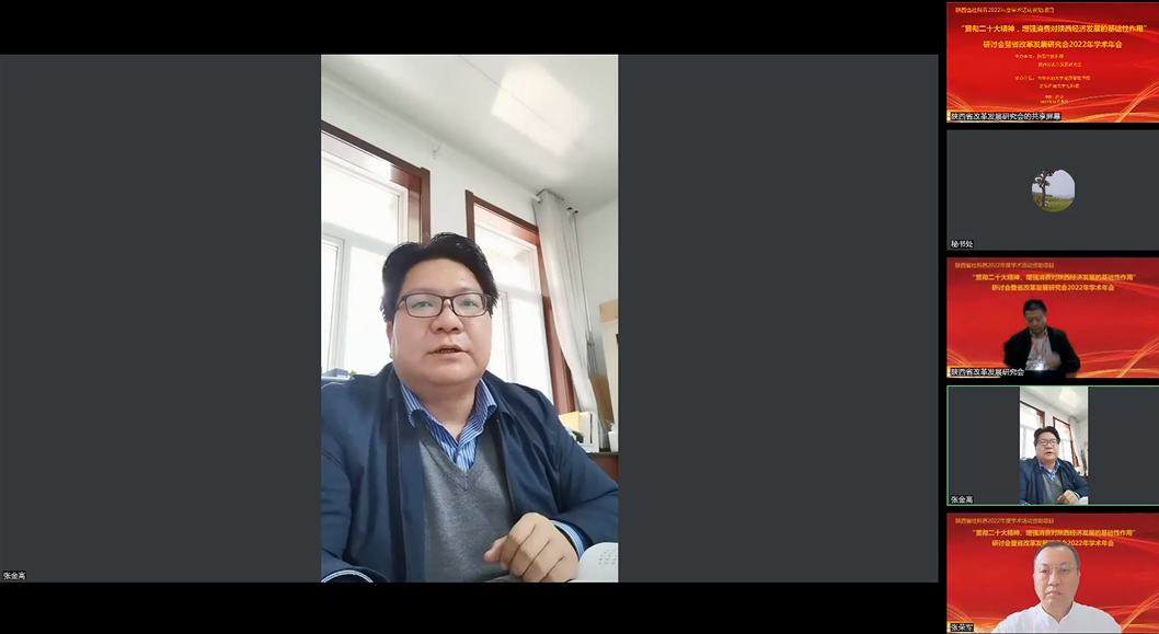 張金高代表省社科聯(lián)對會議的召開表示祝賀,他充分肯定了陜西省改革發(fā)展研究會作為省優(yōu)秀學(xué)術(shù)社團(tuán)在推動社科研究方面的作用,省改革發(fā)展研究會緊扣黨的二十大精神,充分發(fā)揮理論研究優(yōu)勢、人才資源優(yōu)勢,以“增強(qiáng)消費對陜西經(jīng)濟(jì)發(fā)展的基礎(chǔ)性作用”為主題,精心組織專家研究闡釋黨的二十大精神,爭當(dāng)學(xué)習(xí)宣傳貫徹黨的二十大精神的先行者、模范者,為奮力推進(jìn)黨的二十大精神貢獻(xiàn)社科力量,具有重要的學(xué)術(shù)價值和現(xiàn)實意義。學(xué)習(xí)宣傳貫徹黨的二十大精神,是當(dāng)前和今后一個時期社科界的首要政治任務(wù),張金高鼓勵社科組織和廣大社科工作者都應(yīng)充分認(rèn)識黨的二十大的重大意義,鼓勵社科組織采取多種形式,營造濃厚氛圍,掀起黨的二十大精神的學(xué)習(xí)宣傳貫徹?zé)岢薄?/p>