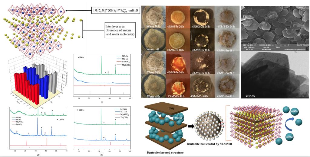 該插層聚合物仍存在許多不足,比如造漿能力不強(qiáng)和攜巖性差。為了解決這些問題,該課題組通過引入Cu、Fe、Zn等離子制備多元插層聚合物(M-MMH),評(píng)價(jià)了其抑制粘土分散的作用,并研究了其作為抗高溫鉆井液基漿組分的可能性,如圖3所示。