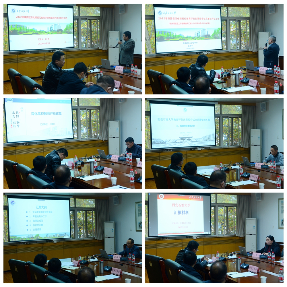 近日,中共陜西省委教育工作領(lǐng)導(dǎo)小組對全省深化新時代教育評價改革綜合試點單位的工作推進情況開展督導(dǎo)評估。11月3日下午,我校作為綜合試點單位,接受了以陜西師范大學(xué)副校長楊祖培教授為組長的高等教育第一專家組的在線督導(dǎo)評估。此次評估工作的線下會場設(shè)在雁塔校區(qū)行政樓五樓會議室,副校長陳軍斌主持會議,高教研究與評估中心、教務(wù)處、人事處、教師工作部等職能部門和相關(guān)學(xué)院負責(zé)人參加了評估會議。