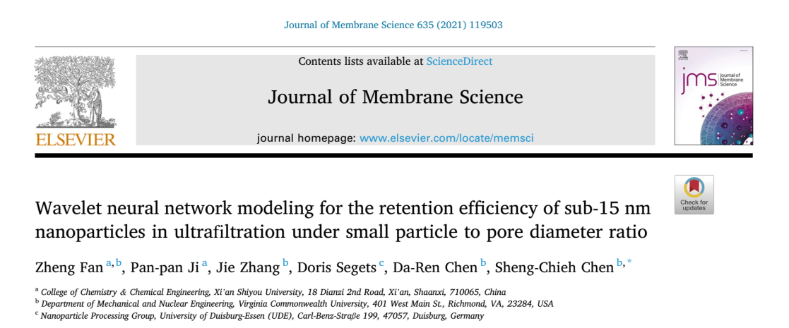 近日,我?;瘜W化工學院范崢、黃風林科研團隊以范崢為第一作者、西安石油大學為第一單位在國際膜科學領域學術期刊《Journal of Membrane Science》(JCR、中科院分區(qū)雙一區(qū)TOP期刊,IF=10.53)上發(fā)表題為《Wavelet neural network modeling for the retention efficiency of sub-15 nm nanoparticles in ultrafiltration under small particle to pore diameter ratio》的高水平論文。