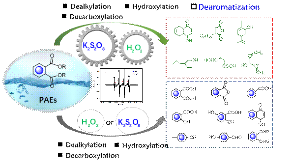 針對(duì)高等氧化方法中單一體系試劑消耗大、去除效率低、反應(yīng)環(huán)境要求高等問題,開發(fā)了一種利用雙氧化劑協(xié)同高效降解頑固污染物鄰苯二甲酸酯的方法。通過簡單的亞鐵離子激發(fā)經(jīng)濟(jì)和環(huán)境相容的雙氧化劑,達(dá)到“1+1?2”協(xié)同效應(yīng),利用協(xié)同產(chǎn)生物種的可持續(xù)氧化能力,突破PAEs惰性芳環(huán)的轉(zhuǎn)化,實(shí)現(xiàn)高效的去除效率。通過對(duì)比分析鄰苯二甲酸酯非靶向產(chǎn)物,發(fā)現(xiàn)在兩種單一氧化劑體系中的降解通過脫烷基化、羥基加成和脫羧作用,以芳香族化合物為主,而協(xié)同催化氧化體系中DMP能夠突破去芳構(gòu)化作用進(jìn)一步深度氧化為脂肪族分子。氧化過程捕獲的高強(qiáng)度的·OH和SO4?-支持導(dǎo)致雙氧化劑對(duì)DMP可持續(xù)氧化能力以及高效降解作用。這項(xiàng)工作為協(xié)同活化高級(jí)氧化策略去除頑固有機(jī)污染物提供重要的思路與展望。