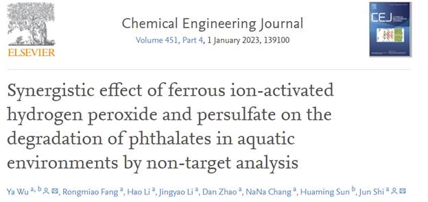 近日,我?;瘜W(xué)化工學(xué)院吳亞副教授、史俊教授在化工領(lǐng)域TOP期刊《Chemical Engineering Journal》( IF 16.744 )上在線發(fā)表了題為“Synergistic Effect of Ferrous Ion-Activated Hydrogen Peroxide and Persulfate on the Degradation of Phthalates in Aquatic Environments by Non-target Analysis”的研究文章(DOI:10.1016/j.cej.2022.139100)。