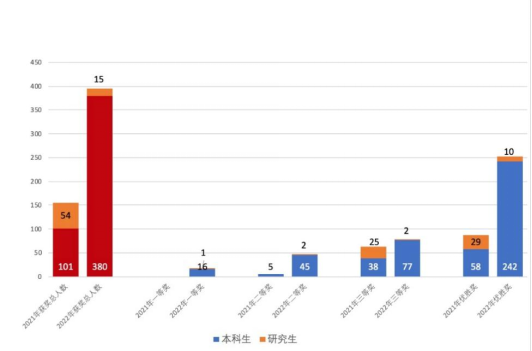 2021年,外國語學(xué)院成立指導(dǎo)教師團(tuán)隊(duì),首次組織我校學(xué)生參與此項(xiàng)賽事,積累了一定的經(jīng)驗(yàn)。2022年,團(tuán)隊(duì)教師齊心協(xié)力,負(fù)責(zé)競(jìng)賽宣傳動(dòng)員、報(bào)名信息收集整理、校內(nèi)模擬和參賽選手賽前分組訓(xùn)練指導(dǎo)工作;參賽學(xué)生積極、認(rèn)真?zhèn)滟?。在師生的共同努力下,我校學(xué)生在本屆全國學(xué)術(shù)英語詞匯競(jìng)賽中成績斐然,在獲獎(jiǎng)等級(jí)和獲獎(jiǎng)比率方面均取得了可喜突破。獲獎(jiǎng)總?cè)藬?shù)為395人,獲獎(jiǎng)率從2021年的約10.5%提高到2022年的約34%。