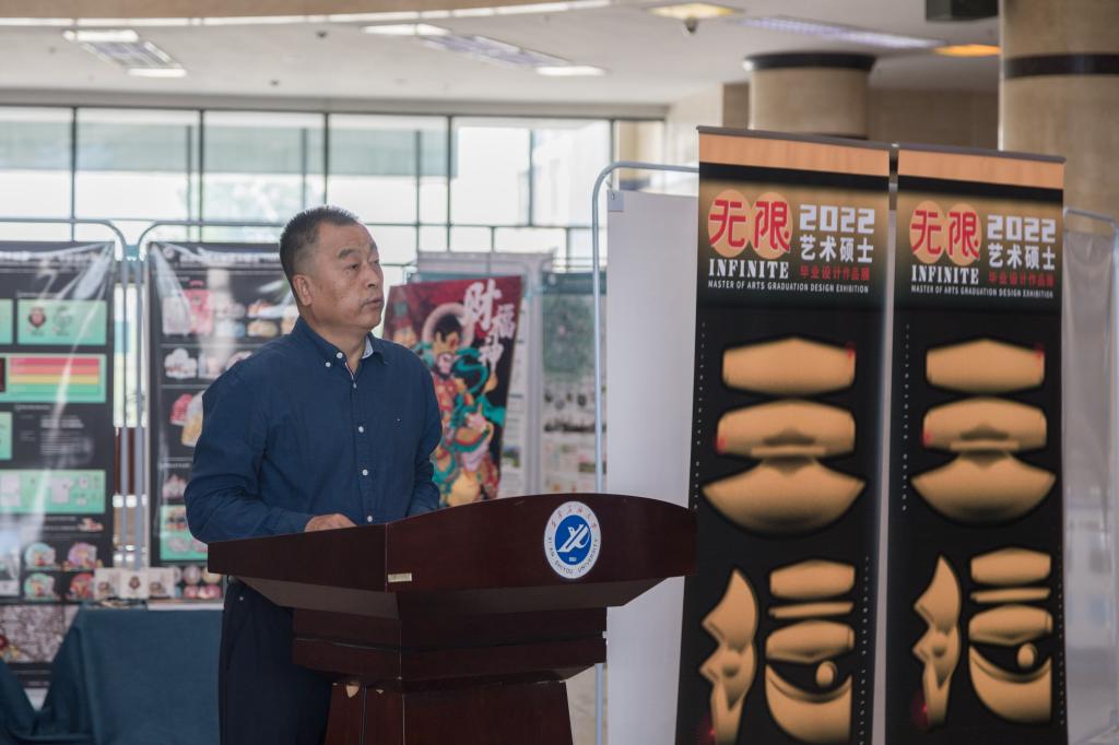 人文學(xué)院藝術(shù)碩士研究生導(dǎo)師肖雪鋒教授代表研究生導(dǎo)師發(fā)言。她說,同學(xué)們用藝術(shù)設(shè)計(jì)的表現(xiàn)手法詮釋著對美的理解和當(dāng)下社會(huì)問題的關(guān)注,參展的每件作品都承載著同學(xué)們的理想和希望,每件作品背后都凝聚著各位導(dǎo)師和同學(xué)們的辛勤汗水、不懈努力與執(zhí)著追求,希望各位同學(xué)前程似錦,努力開啟屬于自己的美好明天。