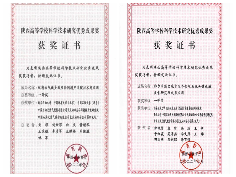劉順教授團(tuán)隊(duì)主持完成的“致密油氣藏多效應(yīng)協(xié)同增產(chǎn)關(guān)鍵技術(shù)與應(yīng)用”和郭艷琴教授團(tuán)隊(duì)主持完成的“鄂爾多斯盆地古生界含氣系統(tǒng)關(guān)鍵成藏要素研究及成果應(yīng)用”兩項(xiàng)成果榮獲陜西高等學(xué)校科學(xué)技術(shù)研究?jī)?yōu)秀成果獎(jiǎng)一等獎(jiǎng)。