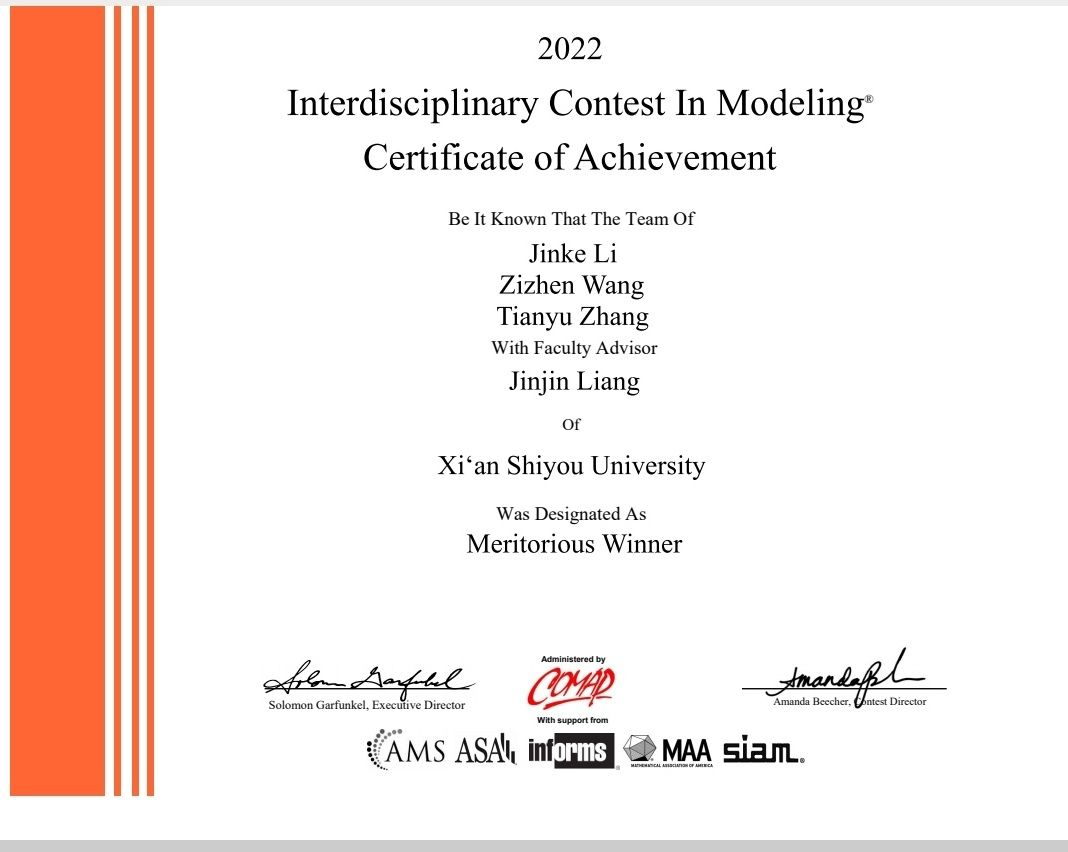 日前,2022年美國大學生數(shù)學建模競賽落下帷幕。在這次比賽中,我校學生李金科、王子禛、張?zhí)煊暝诶韺W院教師梁錦錦的指導下,不負眾望,以優(yōu)異的表現(xiàn)喜獲一等獎(M獎,Meritorious Winner)。