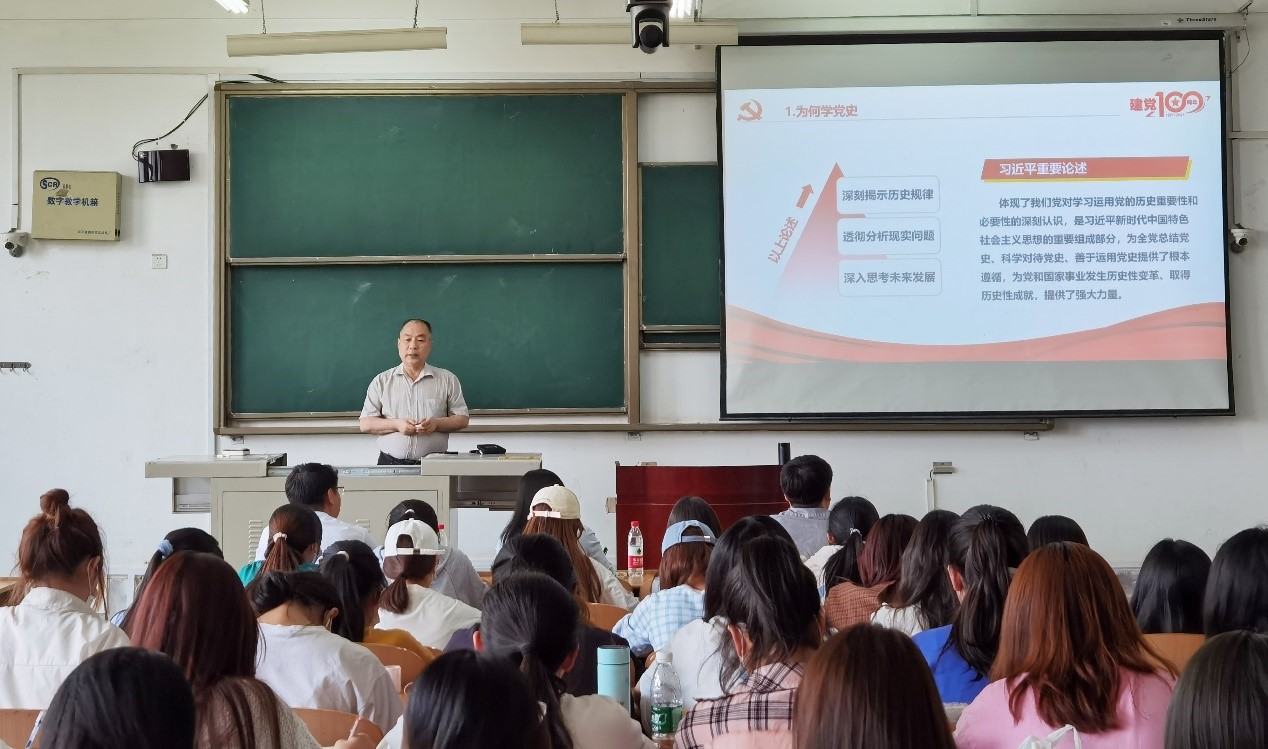 授課中,陳軍斌以開(kāi)展黨史學(xué)習(xí)教育的重大意義為引,從“學(xué)習(xí)黨史的重要性與方法論”“中國(guó)共產(chǎn)黨的百年奮斗歷程”“百年黨史昭示中國(guó)共產(chǎn)黨為什么‘能’”三個(gè)方面展開(kāi)講授。系統(tǒng)講述了黨史學(xué)習(xí)的三個(gè)“必然要求”,進(jìn)一步感悟思想偉力、把握歷史發(fā)展規(guī)律和大勢(shì)、深化對(duì)黨的性質(zhì)宗旨的認(rèn)識(shí)、總結(jié)黨的歷史經(jīng)驗(yàn)五個(gè)方面的黨史學(xué)習(xí)方法論。以“一條主線”“三大飛躍”“四個(gè)階段”帶領(lǐng)師生學(xué)習(xí)了黨的百年奮斗歷程,回顧了黨的十九次代表大會(huì)召開(kāi)情況及歷史意義。并從“科學(xué)的理論指導(dǎo)”“堅(jiān)定的理想信念”“ 強(qiáng)大的組織優(yōu)勢(shì)”“堅(jiān)實(shí)的群眾基礎(chǔ)”“徹底的自我革命”五個(gè)方面深刻闡述了“中國(guó)共產(chǎn)黨為什么‘能’”。他指出,歷史充分證明,只有社會(huì)主義才能發(fā)展中國(guó),只有中國(guó)共產(chǎn)黨才能帶領(lǐng)全體中華兒女實(shí)現(xiàn)中華民族偉大復(fù)興。他強(qiáng)調(diào),黨的百年奮斗歷程蘊(yùn)含了中國(guó)共產(chǎn)黨為什么“能”的思想密碼,是一座資政育人、繼往開(kāi)來(lái)的豐富礦藏,勉勵(lì)師生深入學(xué)習(xí)黨的歷史,從百年黨史中賡續(xù)紅色基因、傳承革命薪火,堅(jiān)定理想信念,夯實(shí)信仰之基,勇?lián)鷷r(shí)代使命,鍛造過(guò)硬本領(lǐng)。