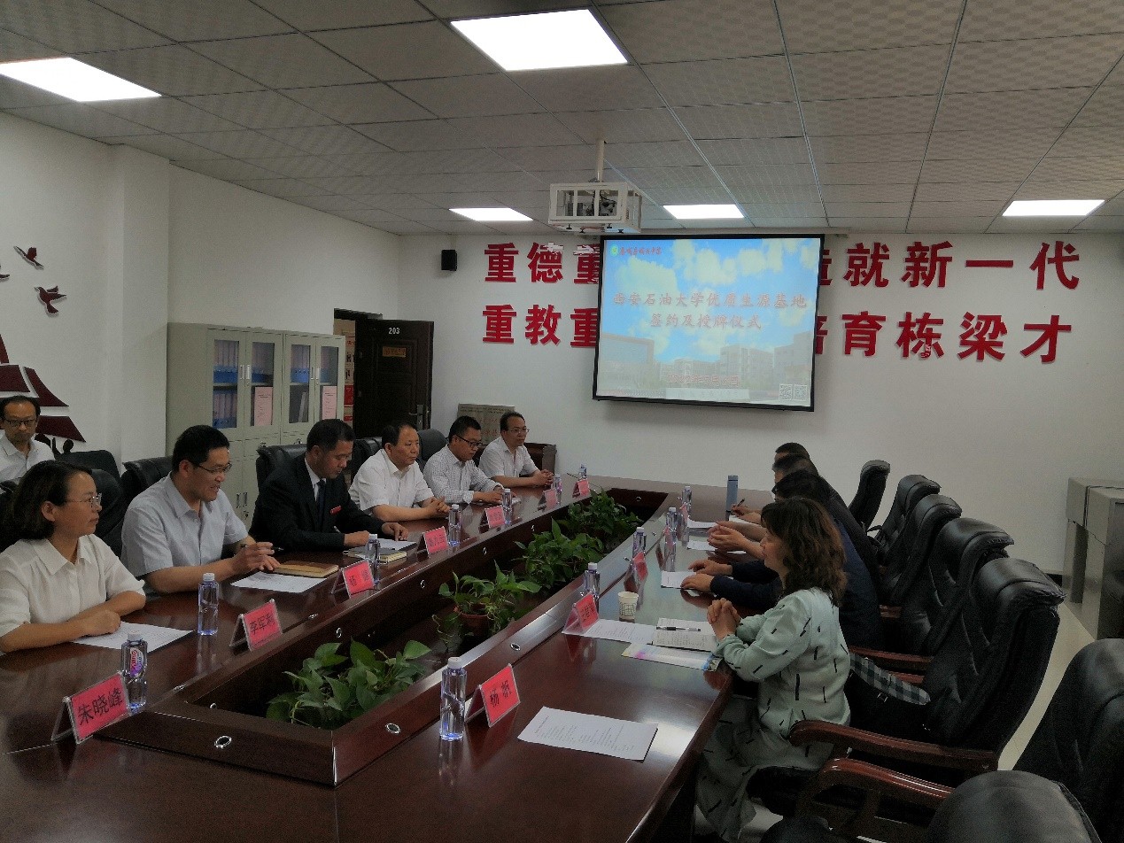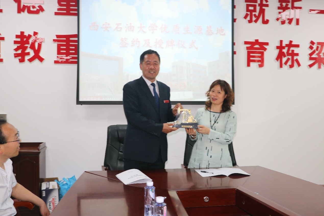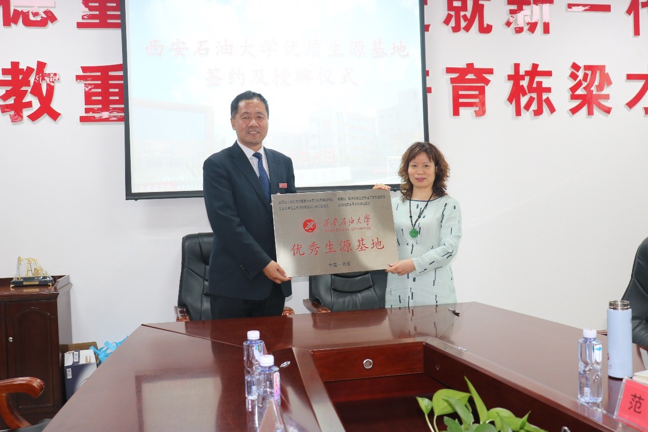 會(huì)上,雙方簽訂了“西安石油大學(xué)優(yōu)秀生源基地”協(xié)議書,王君萍代表學(xué)校向澄城縣城關(guān)中學(xué)授牌。
