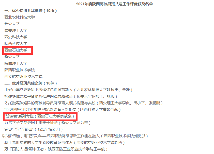 日前,陜西省高校易班發(fā)展中心組織開展2021年度全省易班共建高校評(píng)選活動(dòng),對(duì)易班建設(shè)先進(jìn)集體和優(yōu)秀個(gè)人進(jìn)行表彰。我校被評(píng)為“優(yōu)秀易班共建高?!?,由我校申報(bào)的《朗讀者》系列專欄被評(píng)為“優(yōu)秀易班共建案例”,學(xué)生工作部(處)余靚豪同志被評(píng)為“優(yōu)秀易班指導(dǎo)教師”,機(jī)械工程學(xué)院輔導(dǎo)員馬舒宇老師被評(píng)為“優(yōu)秀易班輔導(dǎo)員”,機(jī)械工程學(xué)院機(jī)械1904班仲衡同學(xué)被評(píng)為“優(yōu)秀易班工作站站長(zhǎng)”。
