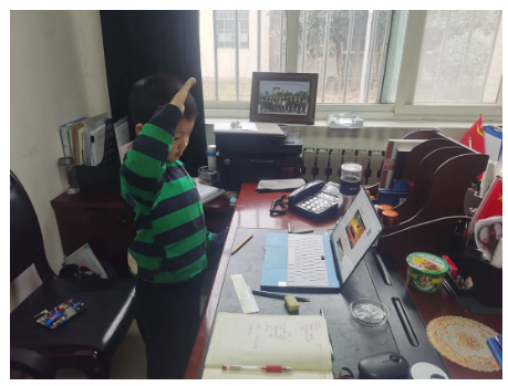 劉念喆在爸爸辦公室通過網(wǎng)課參加新年升旗典禮