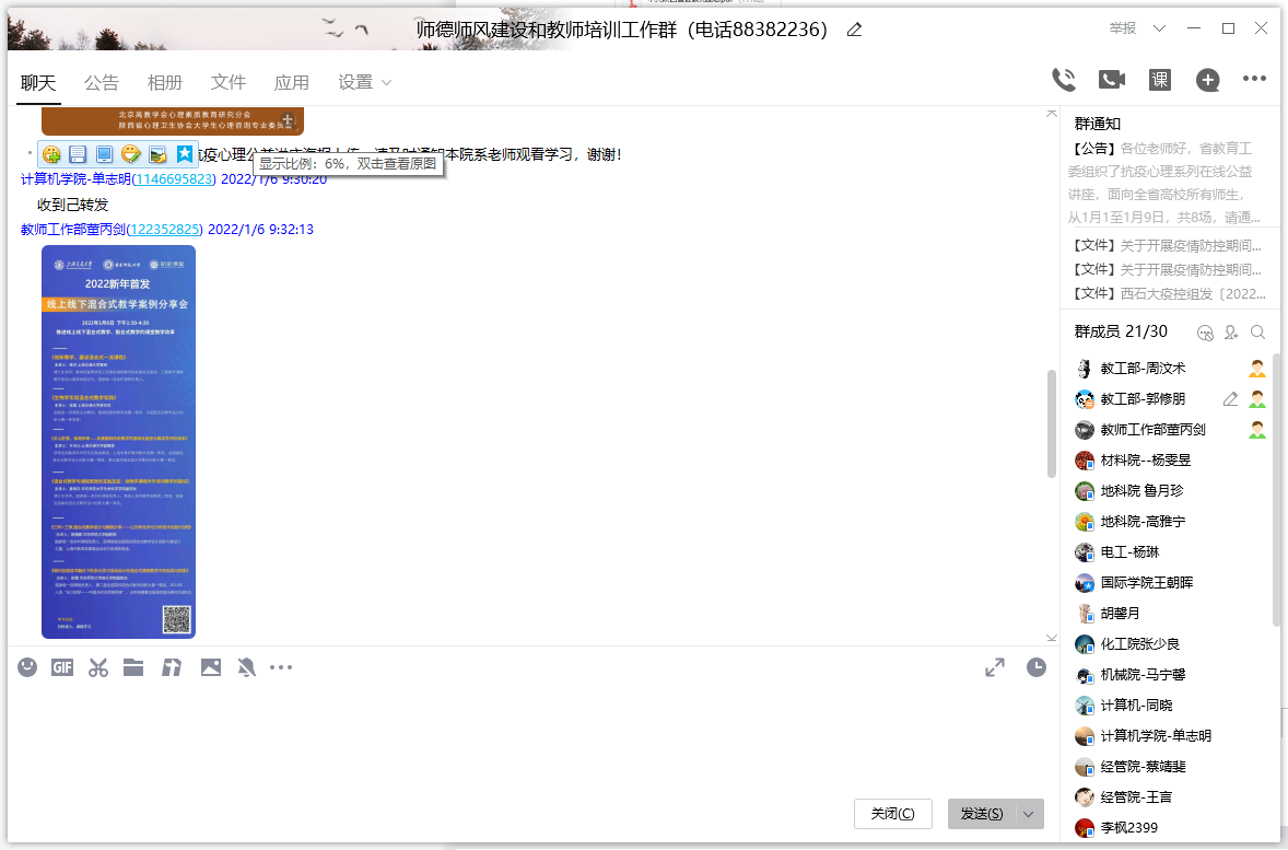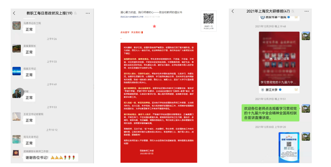 思想政治教育全覆蓋,強化教職工思想引領。建立學校教職工思想政治狀況信息群,各院(系)級單位黨組織書記在群內(nèi)每天上報本單位教職工思想政治狀況,精準排查不漏一人,加強觀測引導,對全校教職工思想政治狀況切實做到底子清、情況明、措施實。發(fā)出《致全校教師的倡議書》,組織教師線上觀看學習貫徹黨的十九屆六中全會精神全國高校聯(lián)合宣講直播講座,在部門所屬各教師群內(nèi)轉發(fā)疫情防控法律法規(guī),教育教師在學校做好老師,在社區(qū)做好公民。