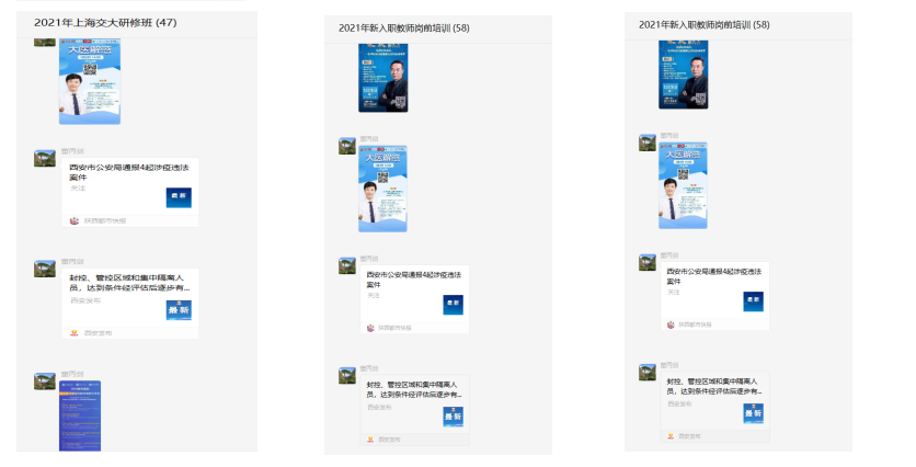 用心服務教師發(fā)展,助力育人能力提升。聯(lián)合教務處組織教師開展課程思政專題網(wǎng)絡學習,切實提升教師課程思政建設的意識和能力。按照省教育廳《關于開展疫情防控期間在線學習公益課的通知》要求,依托陜西省教育系統(tǒng)疫情防控期間在線學習云平臺,下發(fā)學習通知,要求各單位組織管理人員和一線教師開展在線學習公益課,助力疫情防控期間“停課不停學”。轉發(fā)上海交通大學、華東師范大學聯(lián)合舉辦的“助金課堂”系列講座和全國模范教師、北京師范大學教授、博士生導師康震教授線上講座通知,切實提升教師教育教學能力和育人水平。