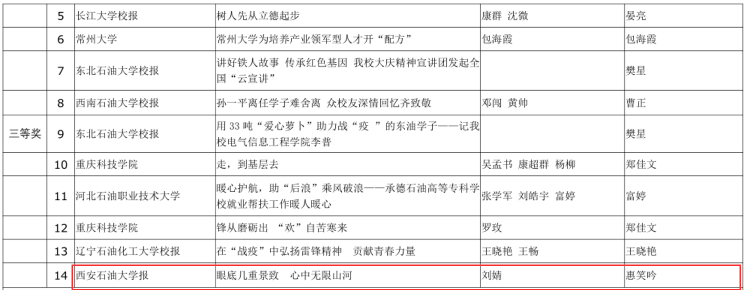 近日,中國石油新聞工作者協(xié)會公布了2020年度中國石油優(yōu)秀新聞作品獎獲獎名單,我校2件校報作品分獲通訊類一等獎和三等獎。