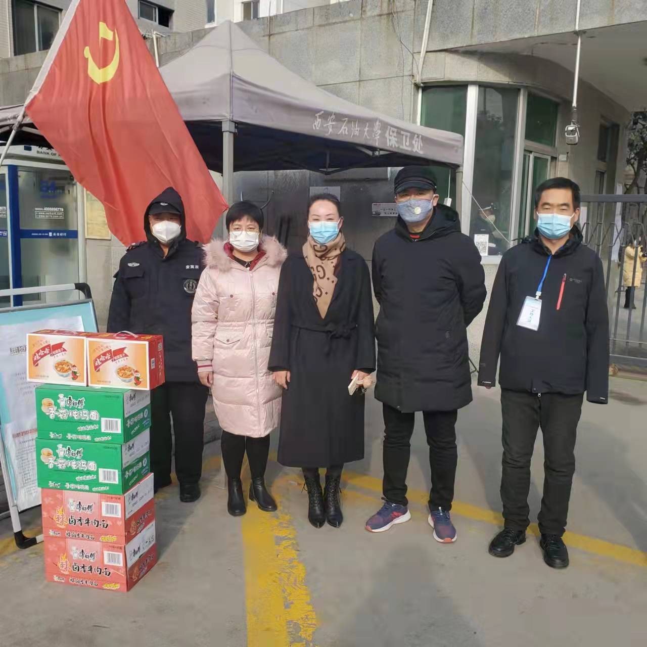 面對當前嚴峻復雜的疫情形勢,學校各部門堅決貫徹落實學校黨委疫情防控決策部署。了解到后勤保障、核酸檢測、安全保衛(wèi)等一線工作人員工作繁忙顧不上吃飯、休息的實際,12月27日,創(chuàng)新創(chuàng)業(yè)中心先后為奮戰(zhàn)在疫情防控一線的后勤處、校醫(yī)院、保衛(wèi)部(處)送去方便面、八寶粥等物資,為一線工作人員送去寒冬里的溫暖,表達了對一線工作人員的感恩和敬意。蘇文甫副校長在現場肯定了創(chuàng)新創(chuàng)業(yè)中心感恩一線送溫暖的行動,表示此舉鼓舞了一線工作人員的干勁,溫暖了一線工作人員的心。