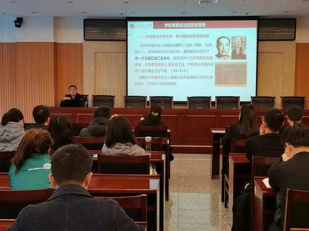 程永清副校長指出,是西北石油的發(fā)展點(diǎn)燃了新中國石油教育的火種。他以中國近代石油工業(yè)的實(shí)踐為引子,運(yùn)用大量珍貴翔實(shí)的歷史資料和照片,介紹了學(xué)校早期創(chuàng)辦的歷史背景,從校名變更、校址變遷、學(xué)校演變史、管理體制變化等方面詳細(xì)講述了學(xué)校的發(fā)展歷程。隨后,程永清副校長從籌建不易、黨的建設(shè)、隊(duì)伍建設(shè)、基本建設(shè)、人才培養(yǎng)、學(xué)風(fēng)建設(shè)、科學(xué)研究、學(xué)科建設(shè)等方面闡述了學(xué)校曲折的辦學(xué)歷程,詳細(xì)講解了學(xué)校教學(xué)改革、科技創(chuàng)新和服務(wù)社會經(jīng)濟(jì)發(fā)展等方面的成就。最后,程永清副校長強(qiáng)調(diào)學(xué)習(xí)歷史是為了更好地走向未來。青年教師要通過學(xué)習(xí)校史、熟悉校情,把握學(xué)校光榮的辦學(xué)歷史和豐富的石油精神內(nèi)涵,努力弘揚(yáng)學(xué)校的光榮傳統(tǒng),以切實(shí)行動助力學(xué)?!笆奈濉币?guī)劃和高水平教學(xué)研究型大學(xué)建設(shè),用努力奮斗書寫學(xué)校光榮的校史。