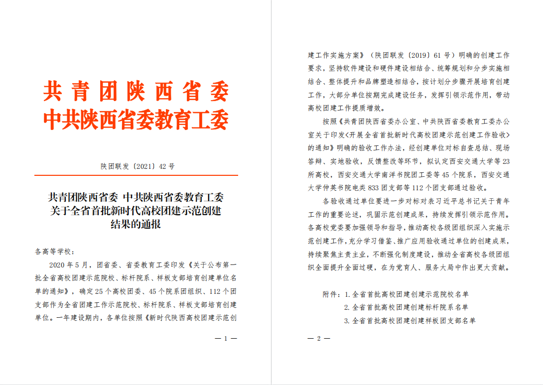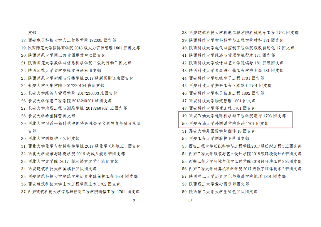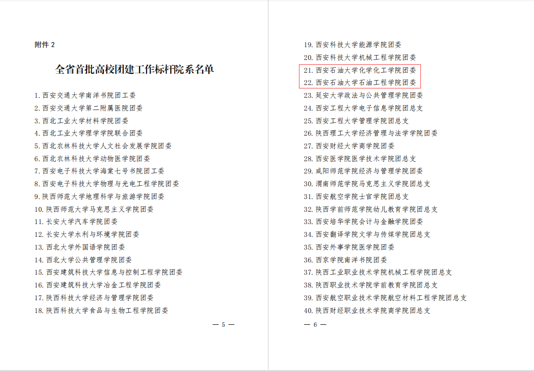 近日,共青團(tuán)陜西省委、中共陜西省委教育工委公布了《關(guān)于全省首批新時(shí)代高校團(tuán)建示范創(chuàng)建結(jié)果的通報(bào)》,我校石油工程學(xué)院團(tuán)委、化學(xué)化工學(xué)院團(tuán)委通過“全省高校團(tuán)建標(biāo)桿院系”驗(yàn)收,地球科學(xué)與工程學(xué)院勘探1703團(tuán)支部、外國語學(xué)院翻譯1701團(tuán)支部通過“全省高校團(tuán)建樣板支部”驗(yàn)收。