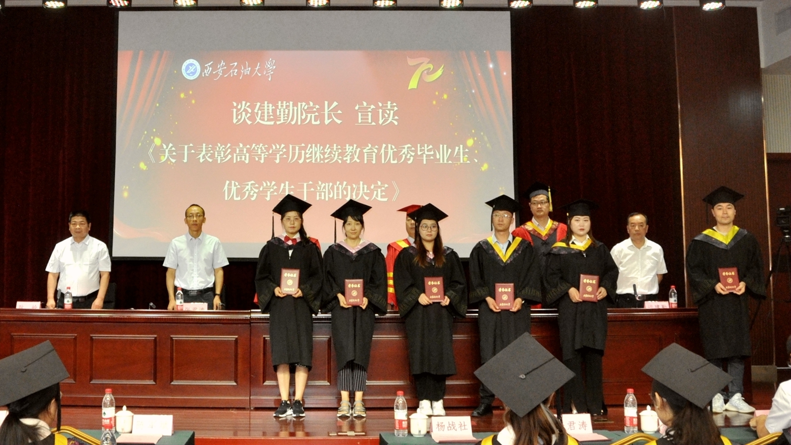 學(xué)位授予儀式在莊嚴(yán)的國歌聲中拉開序幕。首先,校學(xué)位評定委員會委員、繼續(xù)教育學(xué)院院長談建勤宣讀《西安石油大學(xué)關(guān)于表彰高等學(xué)歷繼續(xù)教育優(yōu)秀畢業(yè)生、優(yōu)秀學(xué)生干部的決定》,與會領(lǐng)導(dǎo)和導(dǎo)師為獲得榮譽(yù)的優(yōu)秀學(xué)生代表頒發(fā)榮譽(yù)證書。