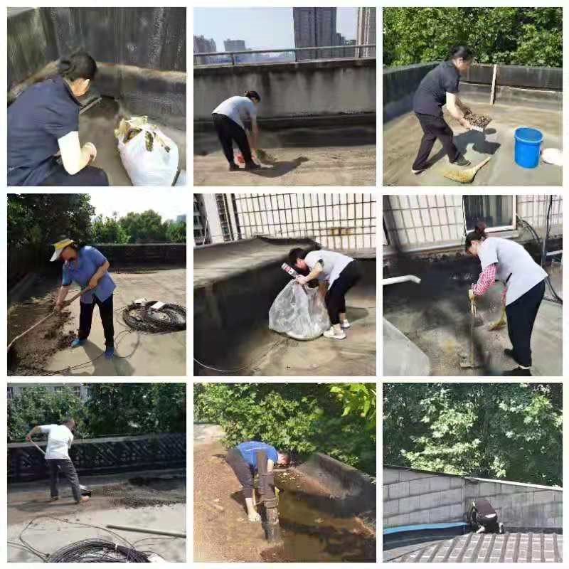 工作人員清理雁塔校區(qū)住宅樓樓頂雨水排水管口
