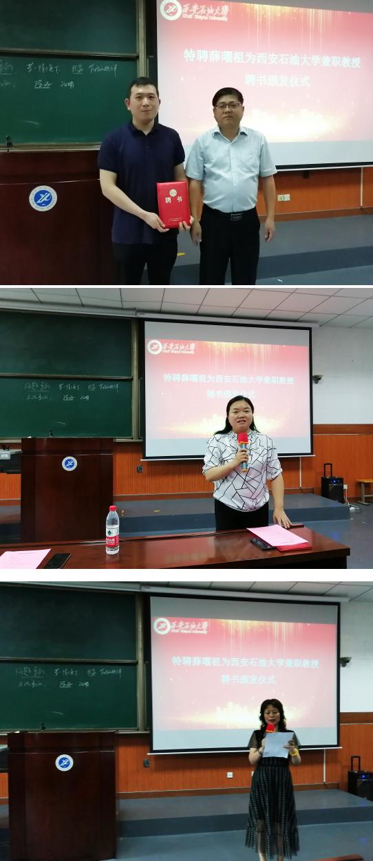 7月1日,特聘薛曜祖為西安石油大學(xué)兼職教授聘書(shū)頒發(fā)儀式在我校雁塔校區(qū)東階201教室舉行。學(xué)??倳?huì)計(jì)師樊曉民,經(jīng)濟(jì)管理學(xué)院相關(guān)負(fù)責(zé)人及師生代表80余人參會(huì),聘書(shū)頒發(fā)儀式由教師工作部部長(zhǎng)武曉朦主持。