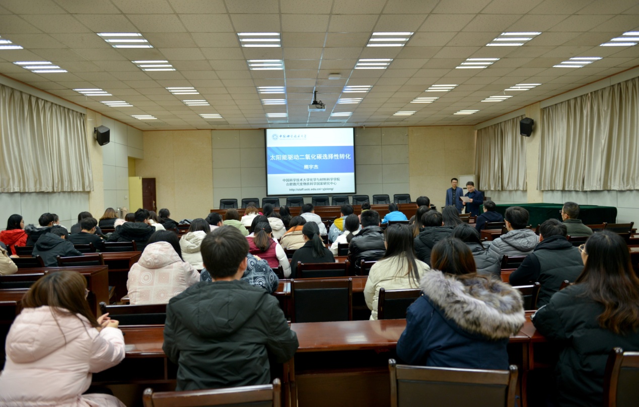 聘任儀式結(jié)束后,熊宇杰教授在第三會議室作了題為《太陽能驅(qū)動二氧化碳選擇性轉(zhuǎn)化》的學(xué)術(shù)報告,學(xué)校師生代表共計90余人聆聽了報告。熊宇杰教授在報告中指出,冰川融化、海平面上升、海水酸化、全球氣候變暖等環(huán)境問題產(chǎn)生的主要原因是二氧化碳的大量排放,但是二氧化碳作為一種穩(wěn)定的分子,在大氣中穩(wěn)定存在,不容易分解。學(xué)術(shù)界針對這一挑戰(zhàn),將研究的目光轉(zhuǎn)向“回歸自然”,利用人工光合作用實現(xiàn)二氧化碳的轉(zhuǎn)化,并就太陽能驅(qū)動二氧化碳轉(zhuǎn)化的兩個條件進(jìn)行了詳細(xì)說明。熊宇杰教授深入淺出的講解,贏得了現(xiàn)場師生的陣陣掌聲。講座結(jié)束后,熊宇杰教授與師生進(jìn)行了互動。