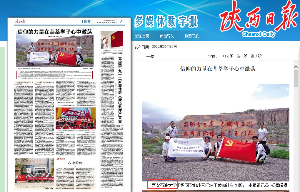 在中國共產(chǎn)黨成立99周年之際,6月30日,《陜西日報(bào)》7版教育版以《信仰的力量在莘莘學(xué)子心中激蕩》為題,對我校黨建工作進(jìn)行了報(bào)道。