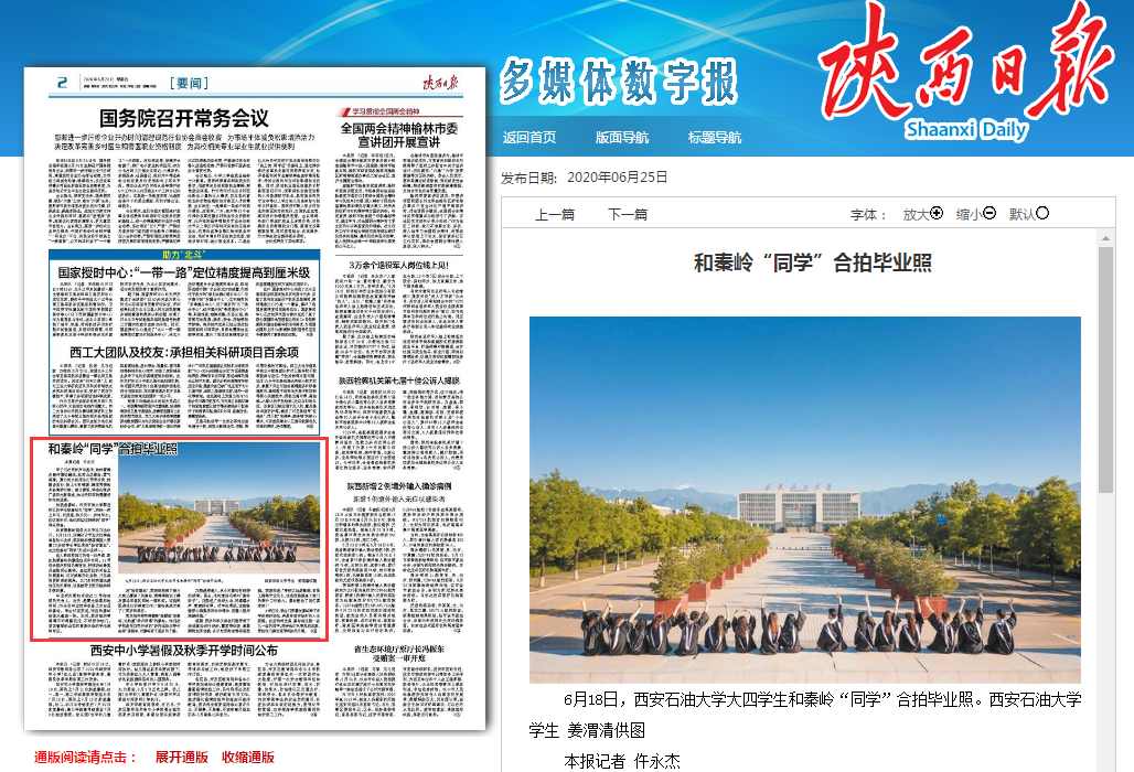 6月25日,《陜西日報》2版刊登的《和秦嶺“同學(xué)”合拍畢業(yè)照》一文,對我校師生進(jìn)行了報道。