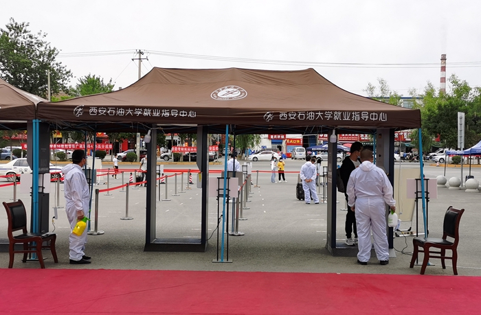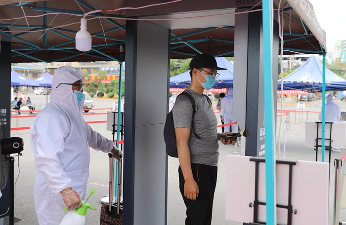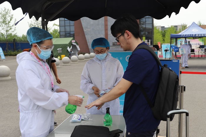 返校當(dāng)天,所有同學(xué)在現(xiàn)場工作人員的指引下,依次有序完成了更換口罩、測量體溫、行李消毒、健康碼核查、身份核實(shí)等流程。