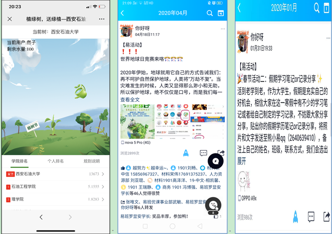 寒假至今,校易班發(fā)展中心累計(jì)開(kāi)展線上活動(dòng)9次,圍繞防疫教育和中國(guó)加油等主題,扎實(shí)開(kāi)展正能量特色活動(dòng)。通過(guò)開(kāi)發(fā)易班輕應(yīng)用,獨(dú)創(chuàng)“植樹(shù)節(jié)為學(xué)校云植樹(shù)”的愛(ài)校榮校活動(dòng),日參與量近千人,截至目前參與總?cè)藬?shù)過(guò)萬(wàn)人。通過(guò)此類(lèi)活動(dòng),進(jìn)一步增強(qiáng)了學(xué)生的集體榮譽(yù)感,提升了學(xué)生參與網(wǎng)絡(luò)思政活動(dòng)的主動(dòng)性,也為我校今后持續(xù)開(kāi)展網(wǎng)絡(luò)思政育人工作積累了寶貴經(jīng)驗(yàn)。