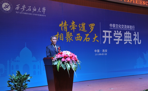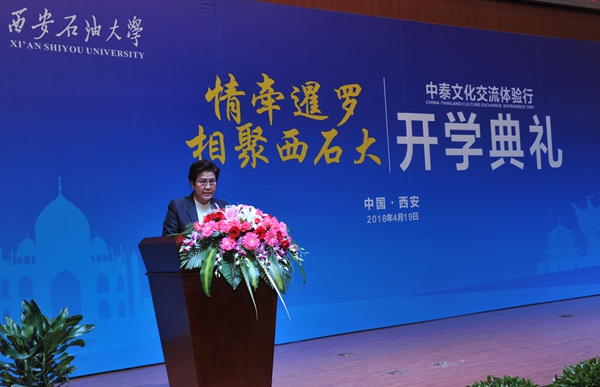 4月19日上午,我校在鄠邑校區(qū)弘石報(bào)告廳隆重舉行“情牽暹羅?相聚西石大——中泰文化交流體驗(yàn)行”項(xiàng)目開(kāi)學(xué)典禮。泰國(guó)薩拉武力府教育廳廳長(zhǎng)維拉彭·德才、泰國(guó)教育部第二教育區(qū)主任拉蒂瑪·帕尼查弩芭、泰國(guó)教育部特殊教育局局長(zhǎng)蘇達(dá)·素嫵,陜西省教育廳副廳長(zhǎng)趙昶葆、我校校長(zhǎng)屈展出席開(kāi)學(xué)典禮。泰國(guó)中學(xué)校長(zhǎng)代表團(tuán)一行17人、參加體驗(yàn)行活動(dòng)的172名泰國(guó)師生以及我校百余名人文學(xué)院師生參加了系列活動(dòng)。副校長(zhǎng)陳軍斌主持儀式。