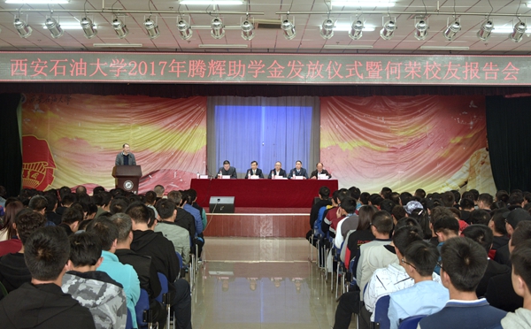 11月10日下午,我校2017年騰輝助學(xué)金發(fā)放儀式暨何榮校友報(bào)告會(huì)在鄠邑校區(qū)騰輝大學(xué)生活動(dòng)中心舉行。校黨委副書(shū)記張木,我校校友、西安騰輝電器有限公司總經(jīng)理何榮出席活動(dòng)。學(xué)生工作處、合作發(fā)展處、機(jī)械工程學(xué)院負(fù)責(zé)人,騰輝公司10余名員工及600余名學(xué)生參加了活動(dòng)。