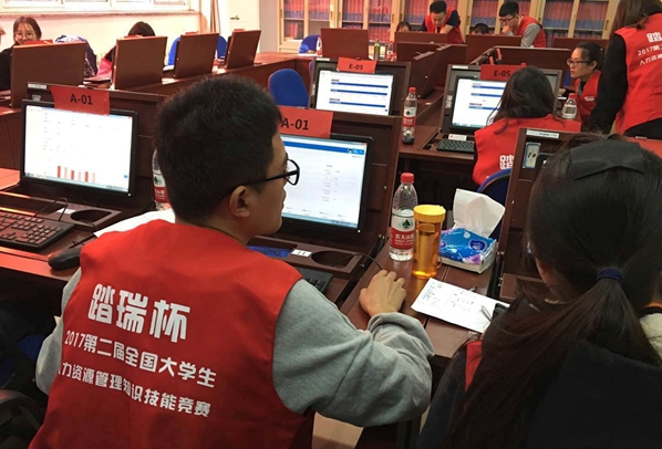 本次大賽是由全國(guó)人力資源開發(fā)研究會(huì)主辦,由上海踏瑞計(jì)算機(jī)軟件有限公司提供全面技術(shù)支持,面向全國(guó)人力資源管理專業(yè)大學(xué)生舉辦的一項(xiàng)重要賽事。為了在比賽中取得優(yōu)異成績(jī),我校隊(duì)員從9月初就開始訓(xùn)練,隊(duì)員們前期熟悉比賽規(guī)則和流程,然后通過反復(fù)實(shí)戰(zhàn)模擬對(duì)抗積累經(jīng)驗(yàn),最后分析總結(jié)形成自己的作戰(zhàn)戰(zhàn)略。比賽分為綜合實(shí)訓(xùn)賽、競(jìng)爭(zhēng)對(duì)抗賽和團(tuán)隊(duì)答辯賽三個(gè)環(huán)節(jié),我校隊(duì)員沉著應(yīng)對(duì),展示了良好的精神面貌和較強(qiáng)的專業(yè)技能。