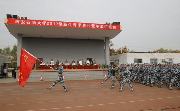 開(kāi)學(xué)典禮暨軍訓(xùn)匯報(bào)會(huì)在激昂的國(guó)歌聲中拉開(kāi)了序幕。伴隨著嘹亮的口號(hào),2017級(jí)新生們?cè)诟髟海ㄏ担┹o導(dǎo)員的帶領(lǐng)下邁著整齊矯健的步伐,精神飽滿地經(jīng)過(guò)主席臺(tái),接受校領(lǐng)導(dǎo)的檢閱。隨后,新生們還進(jìn)行了擒敵拳方陣、武警舞步操方陣、匕首操方陣、舞旗擒敵配套方陣、戰(zhàn)術(shù)解救人質(zhì)演習(xí)、石油學(xué)子花樣隊(duì)形等科目的表演。