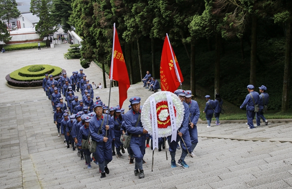 在井岡山烈士陵園,學員們走進青松環(huán)抱、鮮花盛開的紀念大廳,在毛澤東同志書寫的“死難烈士萬歲”的巨幅牌匾前,大家懷著崇敬的心情向長眠在此的英烈們敬獻了花圈。