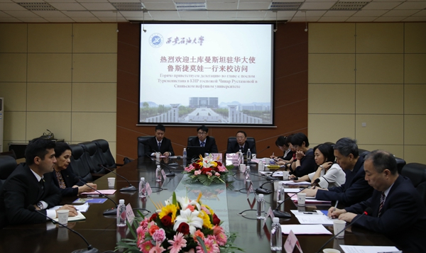 揭牌儀式后,學校與土庫曼斯坦駐華大使館舉行了合作座談會。雙方就發(fā)揮土庫曼斯坦中心平臺作用,落實和推進學校與土庫曼斯坦高校合作以及土庫曼斯坦中心后續(xù)建設(shè)工作進行了深入探討。雙方表示,將積極推進落實互派留學生、教師互訪和講學、土庫曼斯坦能源展、土庫曼斯坦高??疾旖涣?、申請土庫曼斯坦總統(tǒng)獎學金等工作。